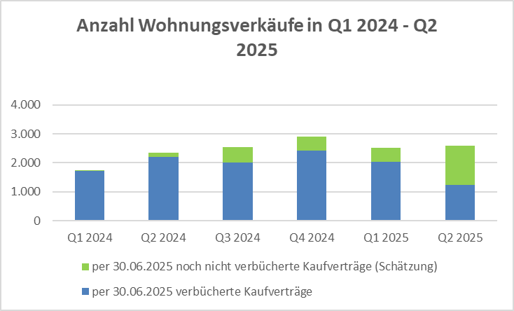Wir gehen aktuell davon aus, dass im Jahr 2024 rund 9.500 Wohnungen verkauft wurden, hiervon rund 4.000 im ersten Halbjahr. Im ersten Halbjahr 2025 dürfte der Wert bereits bei rund 5.100 gelegen sein und somit um rund 25% höher. Unter Berücksichtigung der üblichen saisonalen Schwankungen gehen wir aktuell davon aus, dass die Transaktionsanzahl, weitere wirtschaftliche Eintrübungen und politische Eingriffe vorbehalten, jedenfalls auf über 12.000 Wohnungen steigen wird.