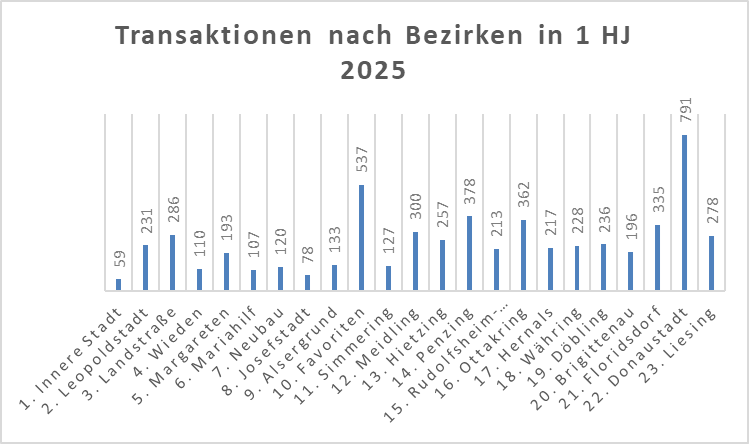 Obige Grafik zeigt die Verteilung der im Q2/2025 verbücherten Wohnungstransaktionen auf dem Wiener Wohnungsmarkt. Spitzenreiter ist der Donaustadt, gefolgt von Favoriten. Stärkster Innenbezirk war die Landstraße.
