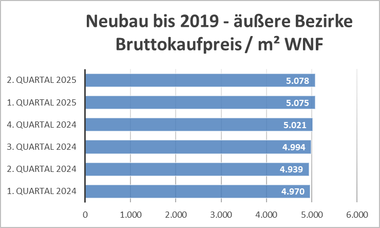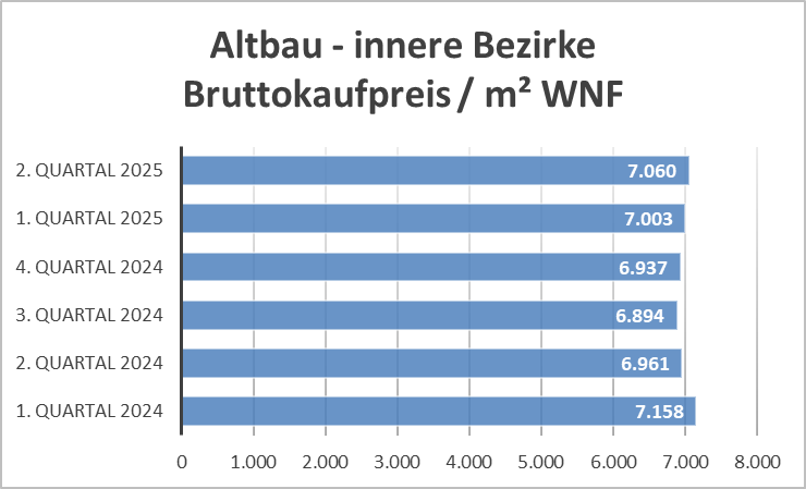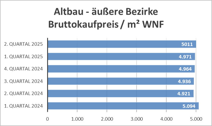 Bei den angebotenen Kaufpreisen sehen wir abermals eine faktische Seitwärtsbewegung. Anzumerken ist, dass der Zustand des Hauses bzw. der Wohnung große Auswirkungen auf den Preis hat. Betrachtet man nur frisch sanierte Altbauwohnungen liegt der durchschnittlich angebotene Preis über alle Außenbezirke bei rund EUR 5.800 / m².