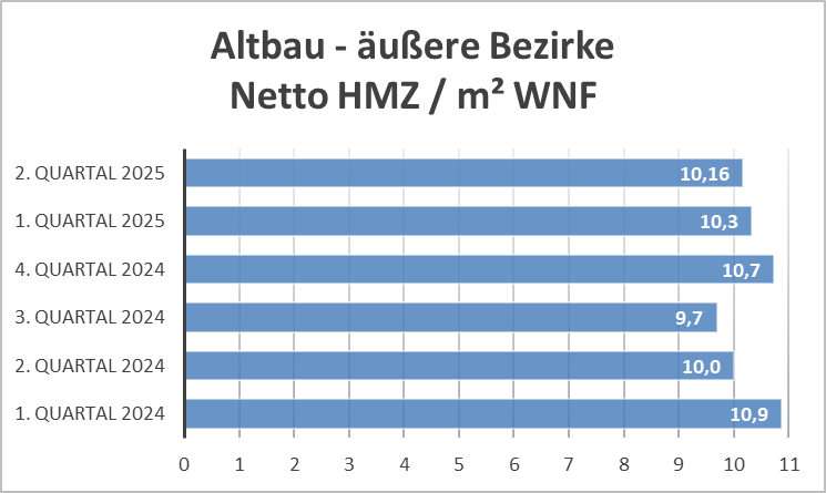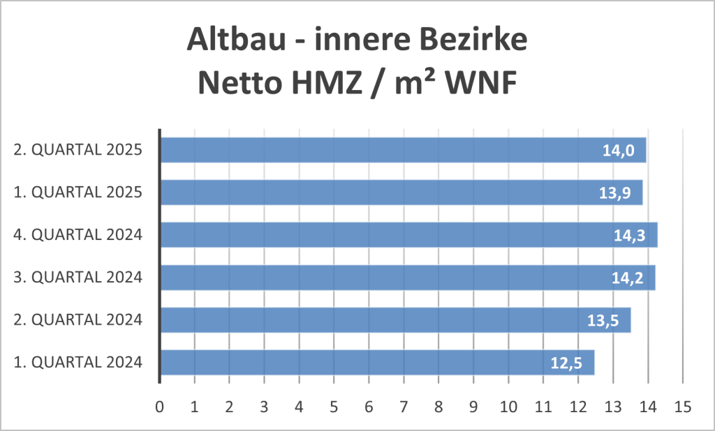 Die Werte sind aufgrund der Heterogenität des Segments mit Vorsicht zu genießen. Zum einen werden Nobelgegenden mit Brennpunktgrätzeln gemischt, zum anderen macht es natürlich einen großen Unterschied, ob eine Wohnung 5 oder 50 Jahre alt ist.