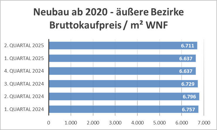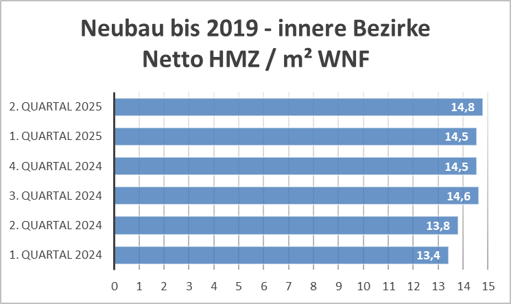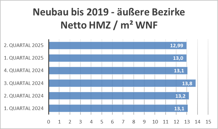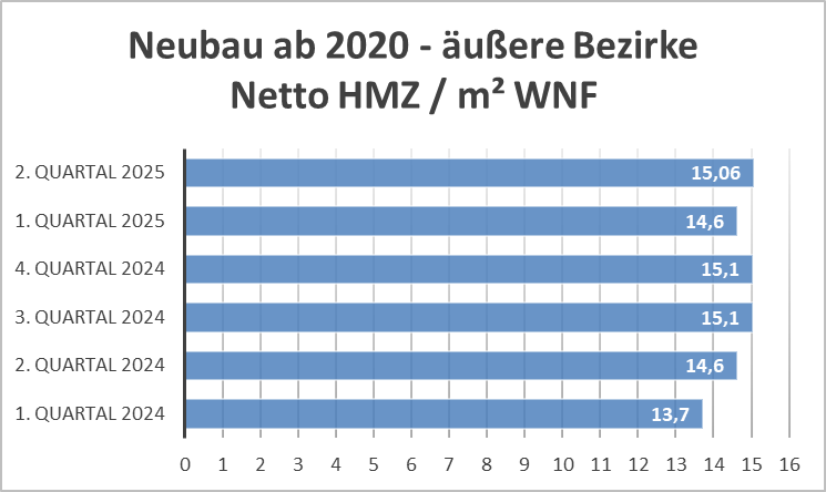 In den äußeren Bezirken stiegen die Mieten für kürzlich fertiggestellte Neubauten im Q2 2025 an, im Wesentlichen getrieben durch einige ganz neu auf den Markt kommende Projekte. Nimmt man nur Erstbezüge her liegt der durchschnittliche Nettomietpreis bereits bei EUR 15,5 / m². Hierzu ist anzumerken, dass das Segment nicht homogen ist. In schlechter angebundenen größervolumigen Projekten liegen die Untergrenzen bei rund EUR 13,5 – 14. Besser angebundene und „exklusivere“ Erstbezüge liegen mitunter deutlich über EUR 18 / m².