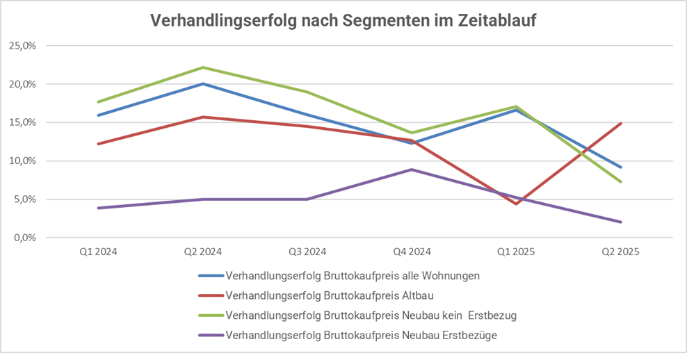 Der guten Ordnung halber an dieser Stelle unser Hinweis, dass das Sample zu klein ist, um Aussagen auf einem 10% Signifikanz-Niveau zu ermöglichen. Dennoch sticht das Auseinanderfallen des regelmentierten und des nicht regelmentierten Sektors ins Auge. Die neue Bundesregierung setzte bekanntlich die Indexierungen von Wohnungen im Vollanwendungsbereich des MRG aus bzw. beschränkte diese. Der Markt reagierte sofort. Der Verhandlungserfolg im Altbausegment, im obigen Diagramm repräsentiert durch die rote Linie, stieg im Q2 2025 als einziger an, wogegen der Verhandlungserfolg in allen anderen Segmenten zurückging. Käufer verlangen im regelmentierten Segment nun einen höheren Rabatt und somit einen niedrigeren realen Kaufpreis.