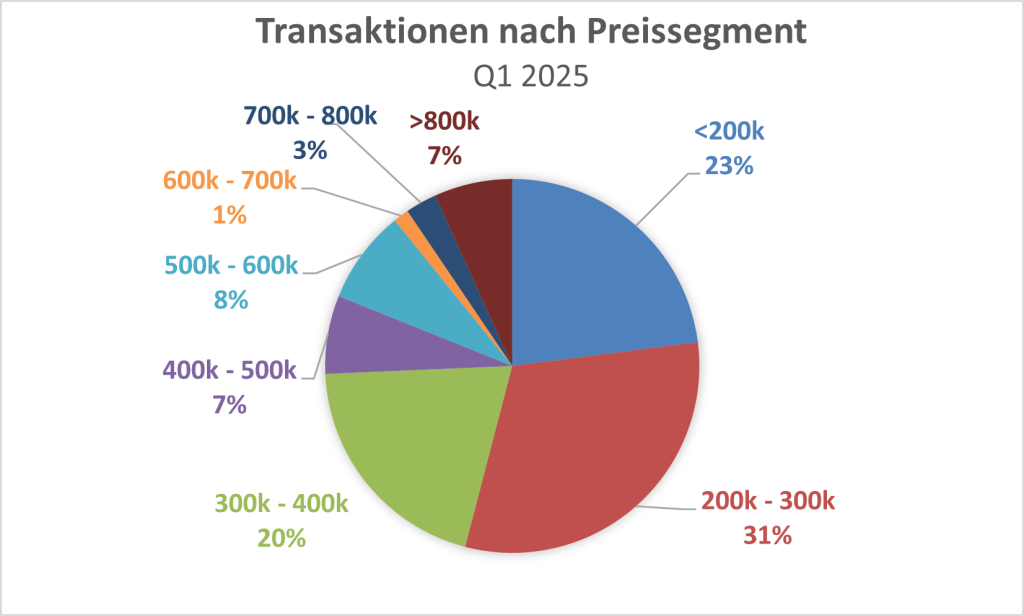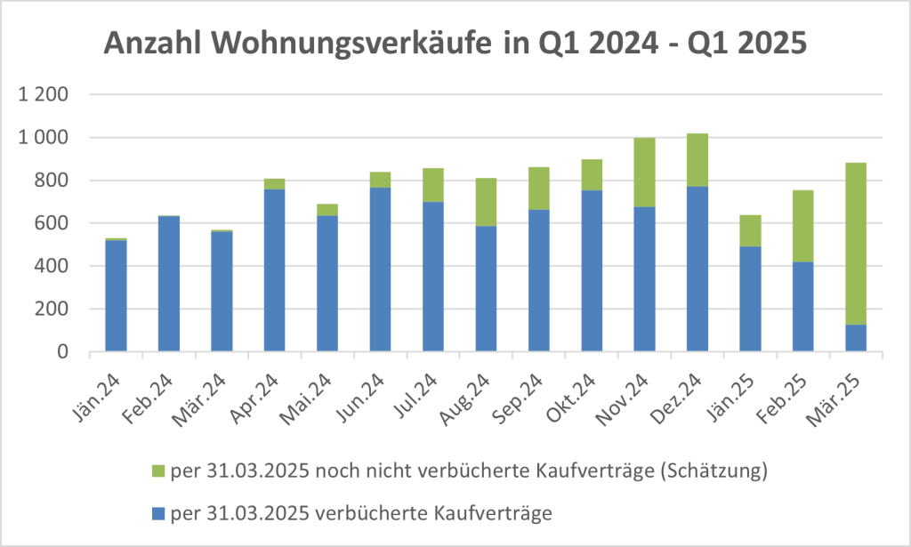 Wir gehen aktuell davon aus, dass im Jahr 2024 rund 9.500 Wohnungen verkauft wurden. Der Wert für das Q1/2025 dürfte bei rund 2.200 – 2.500 Transaktionen liefern, was unter Berücksichtigung der üblichen saisonalen Schwankungen einen guten Start ins neue Jahr darstellt. Wir gehen somit aktuell davon aus, dass das Transaktionsvolumen gegenüber dem Vorjahr deutlich zulegen wird.