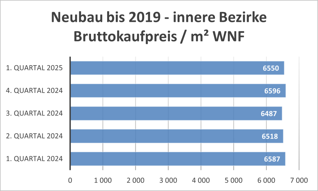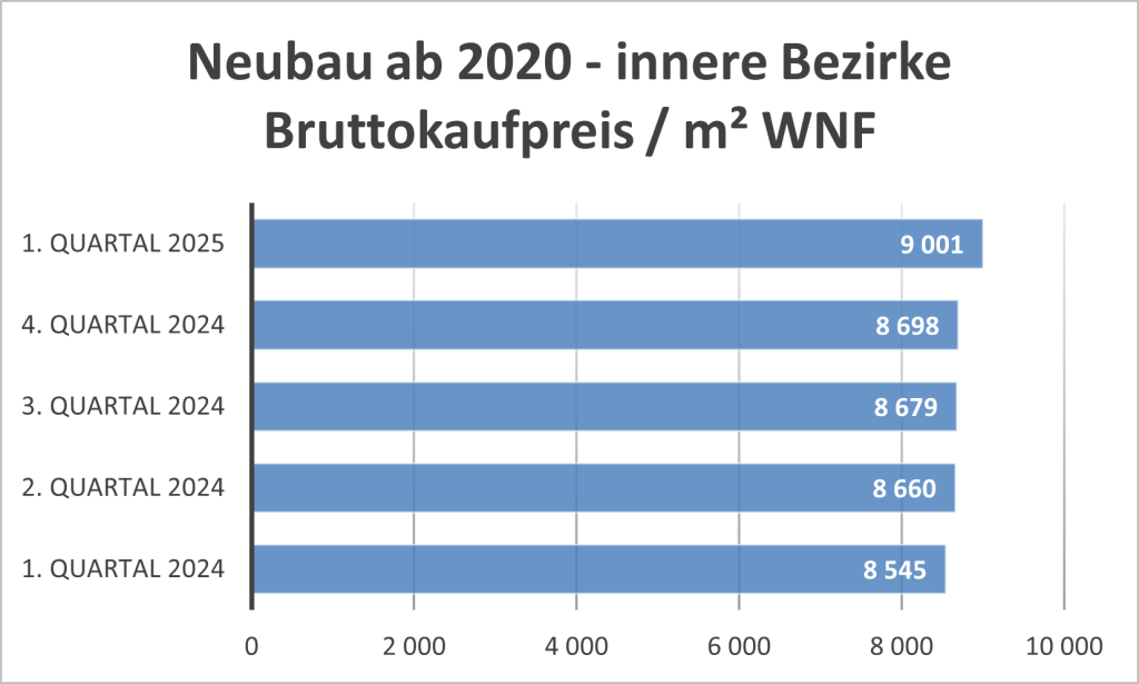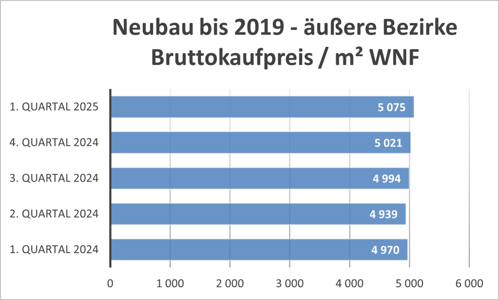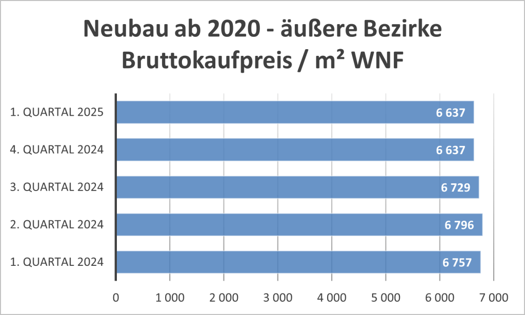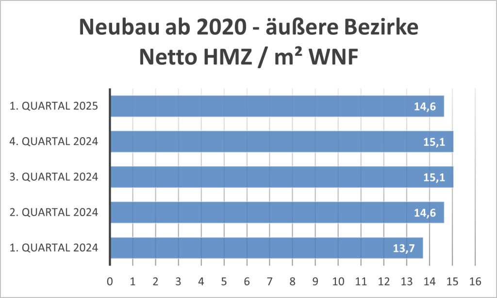 Ähnliches wie zuvor in den inneren Bezirken gilt auch für kürzlich fertiggestellte Neubauten in den äußeren Bezirken. Die Mieten gingen im Q1 2025 etwas zurück, wobei der Rückgang auf den Wechsel der Mieter ins Käufersegment zurückzuführen sein dürfte.