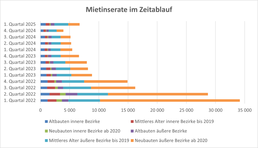 In der oberen Grafik sehen wir einen geringfügigen Rückgang im Q1 2025, allerdings nach einem starken Anstieg in den Quartalen zuvor. Die angebotenen Mietpreise liegen auch unter Berücksichtigung aller möglichen Zuschläge sehr am oberen Ende des rechtlich möglichen, weshalb sich kaum Rückschlüsse auf die Marktentwicklung ziehen lassen. Der Verhandlungserfolg geht stark gegen Null.
