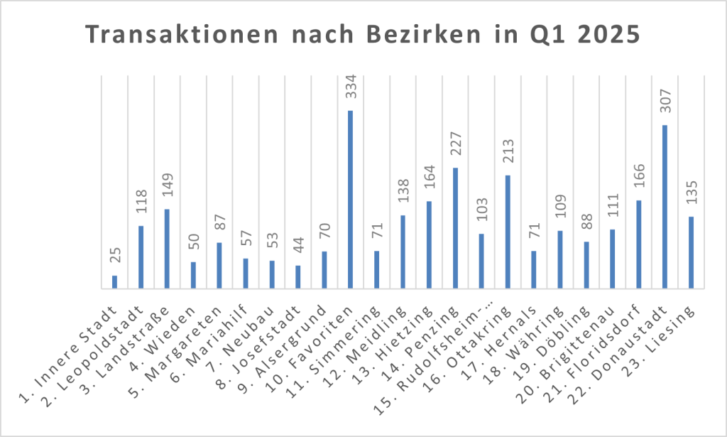 Obige Grafik zeigt die Verteilung der im Q1/2025 verbücherten Wohnungstransaktionen auf dem Wiener Wohnungsmarkt. Spitzenreiter ist der Flächenbezirk Favoriten, gefolgt von Donaustadt. Stärkster Innenbezirk war die Landstraße.