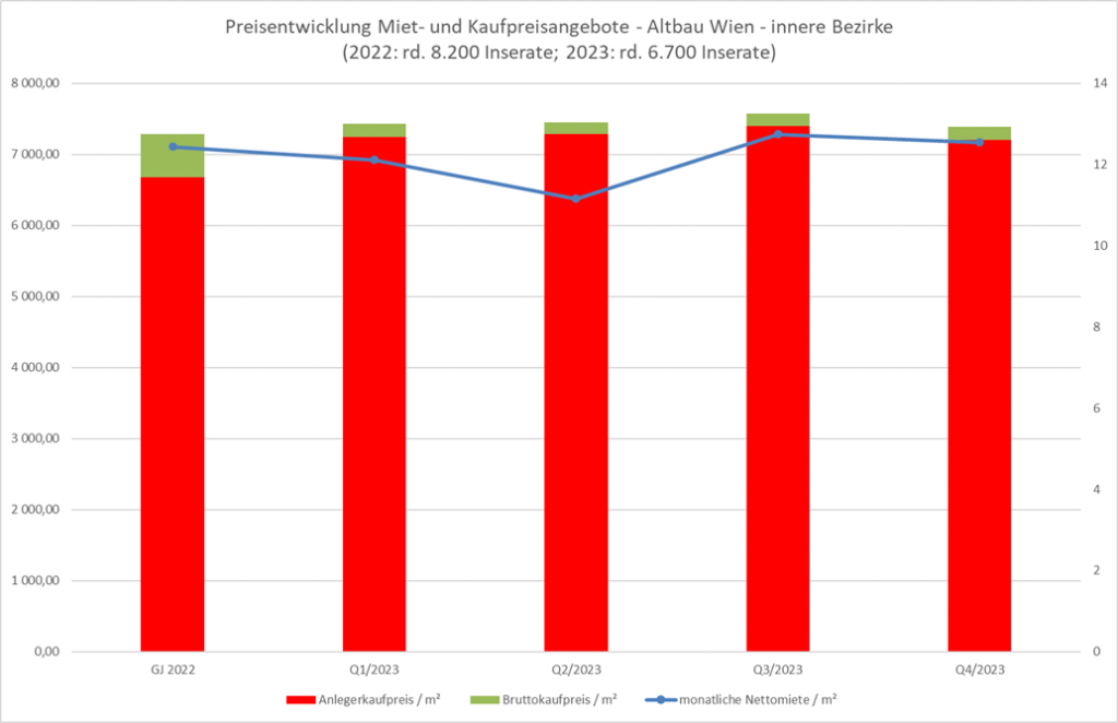 In den inneren Bezirken kam es bereits zu Jahresbeginn zu einem Rückgang der angebotenen Bruttokaufpreise, die im weiteren Jahresverlauf auf einem Niveau von rund EUR 8.700 / m² seitlich verliefen. In den äußeren Bezirken kam es zu Jahresbeginn zunächst sogar zu einem geringfügigen Anstieg der Angebotspreise, bevor sich auch hier eine Seitwärtsbewegung auf einem Level von rund EUR 6.700 / m² einstellte.