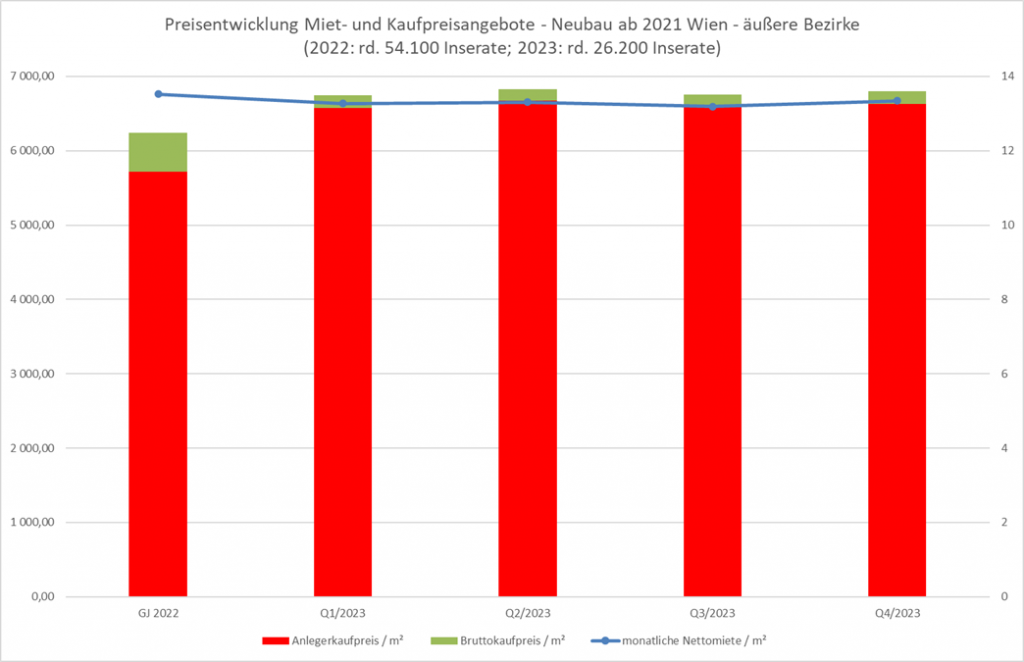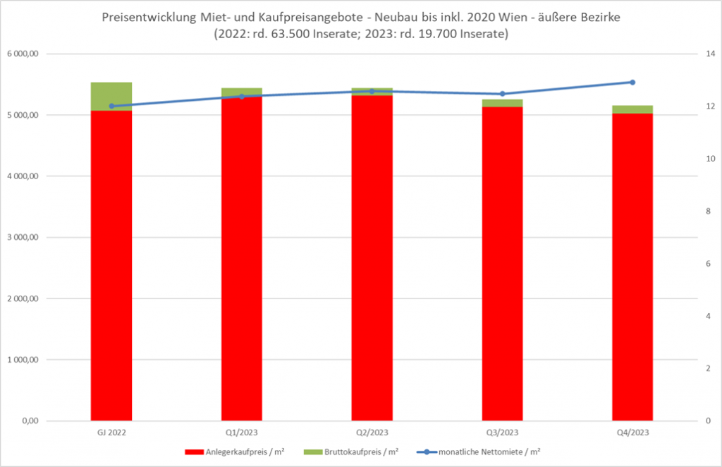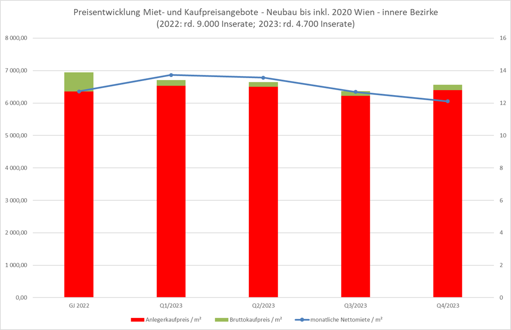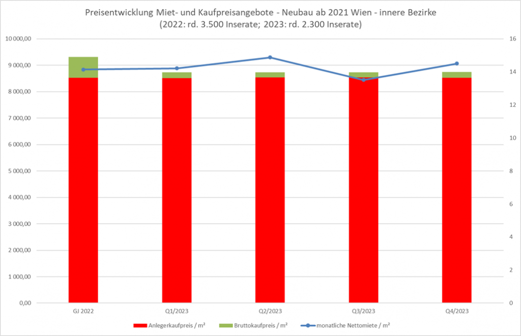 Die angebotenen Bruttokaufpreise für Neubauten gingen In den inneren Bezirken bereits Ende 2022 / Anfang 2023 im einstelligen Prozentbereich zurück und verlaufen seither stabil. In den äußeren Bezirksteilen stiegen die angebotenen Bruttokaufpreise für kürzlich fertiggestellte Immobilien zu Jahresbeginn teilweise sogar an, doch wurde dies durch den stark steigenden Verhandlungserfolg überkompensiert. Im 2. HJ gingen Angebotspreise und Verhandlungserfolg zurück. In Summe betrug der Rückgang der tatsächlichen Bruttokaufpreise gegenüber ihrem Höchststand im Q2/2022 rund 10%.