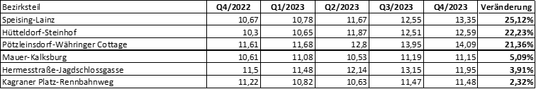 Es zeigt sich somit, dass dieselbe Mietwohnung im Jahresverlauf in jedem Bezirksteil etwas teurer geworden ist. Die maximalen Steigerungsraten lagen sogar bei über 20%.