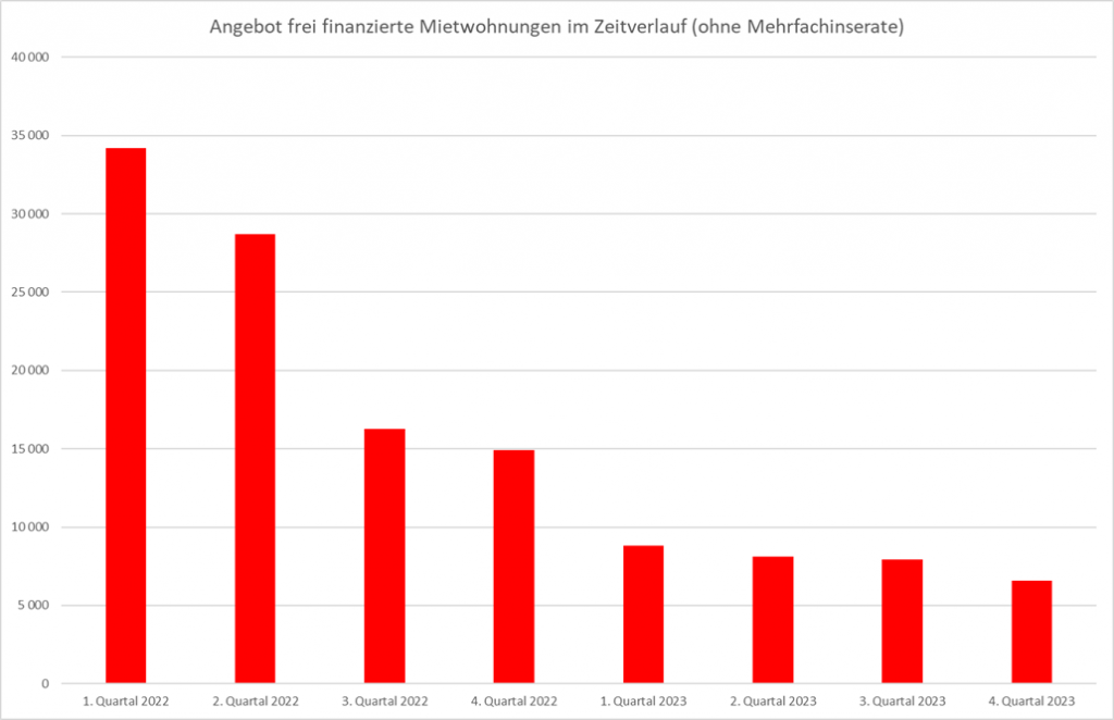 Bei Betrachtung der o.a. Grafiken zeigt sich, dass das Angebot an Eigentumswohnungen im Jahr 2023 deutlich, jenes der frei finanzierten Mietwohnungen fast dramatisch gefallen ist.