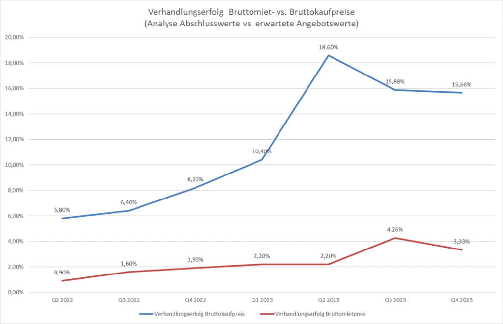 So zeigt sich im Bereich der Verkaufspreise, dass die Angebotspreise weitgehend stabil bleiben oder sehr geringfügig sinken, während der Verhandlungserfolg zunächst stark anstieg und erst im Q3/2023 auf sehr hohem Niveau etwas zurück ging.