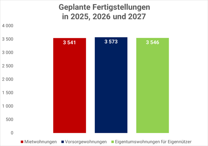 Wir stellen bei den Auswertungen auf das voraussichtliche Fertigstellungsdatum ab. Selbstverständlich gibt es derzeit ein in den Vorjahren fertiggestelltes Angebot, welches noch nicht verwertet ist, ebenso wie am 31.12.2027 nicht alle in den Jahren 2025 – 2027 fertig gestellten Wohnungen verwertet sein werden. Umgekehrt gibt es Projekte, die erst 2025 fertig gestellt werden, die aber bereits zu großen Teilen vorverwertet sind. Der Vorteil beim Abstellen auf das Fertigstellungsjahr liegt darin, dass sich die Zahlen bereits sehr gut abschätzen und dem Bedarf gegenüberstellen lassen.