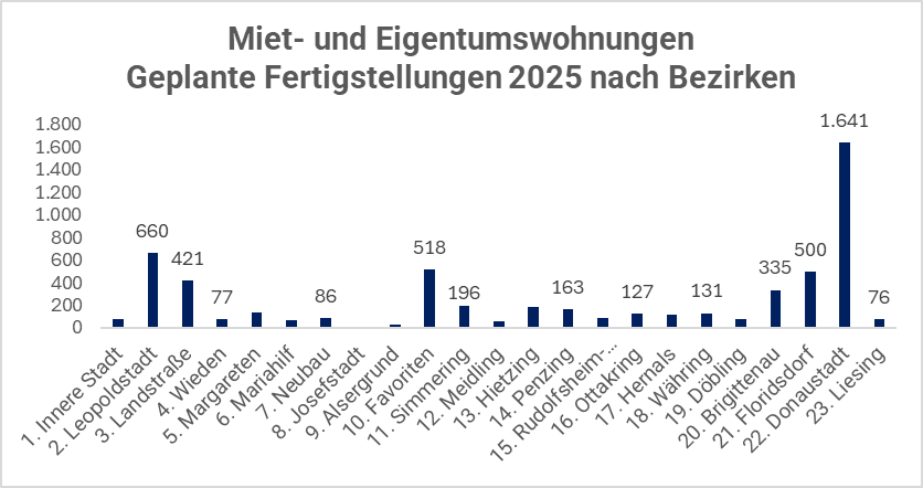 Wenig überraschend dominieren Bezirke, in welchen Großprojekte fertig gestellt werden. So steuern in der Donaustadt die DANUBEFLATS, das VIENNATWENTYTWO oder die DC-FLATS große Teile der 2025 fertiggestellten Wohnungen bei. Ähnliches gilt für das Projekt Grünblick in der Leopoldstadt. In der Landstraße dominiert das Stadtentwicklungsgebiet Village im Dritten, allerdings aufgeteilt auf mehrere Projekte. Ähnliches gilt in Floridsdorf mit dem Stadtentwicklungsgebiet Hirschfeld. Die anderen Bezirke zeigen hinsichtlich der Neuentwicklungen ein stärker fragmentiertes Bild, wenngleich es auch hier natürlich größere Projekte wie das MiLiving in Favoriten gibt.