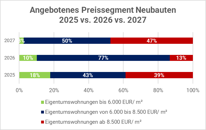 Hierbei zeigt sich, dass immerhin noch 18% der im Jahr 2025 geplanten Fertigstellungen bei (knapp) unter EUR 6.000 / m² Bruttoverkaufspreis liegen. Bei den geplanten Fertigstellungen 2026 geht dieser Anteil bereits auf 10% zurück. Ab 2027 gibt es de facto kein Angebot unter EUR 6.000 / m² mehr.