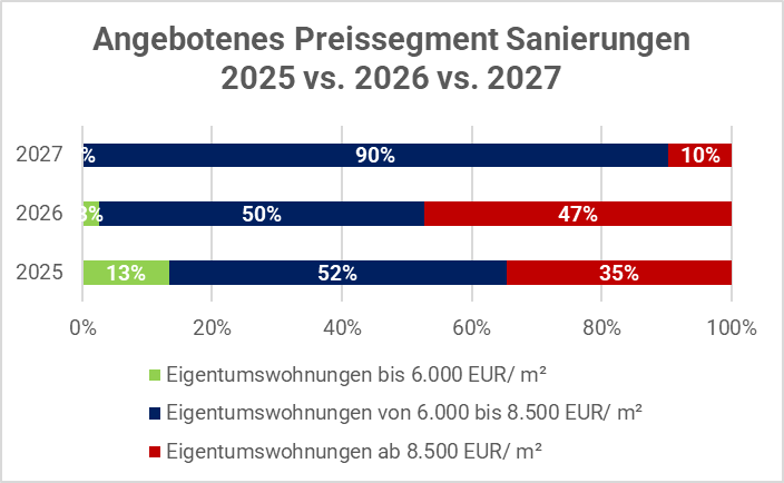 Bei Analyse des Angebots im Bereich der Altbausanierungsprojekte zeigt sich, dass der Anteil der Wohnungen im untersten Preissegment sogar noch etwas geringer ist und auch weiter zurückgeht.