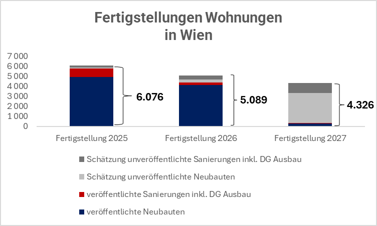 Vor diesem Hintergrund und auch beim Vergleich mit anderen in den vergangenen Monaten kommunizierten Fertigstellungszahlen halten wir unser Ergebnis für ein sehr genaues Abbild der Fertigstellungen auf dem frei finanzierten Wiener Wohnungsmarkt in den Jahren 2025 und 2026. Die Zahlen für 2027 sind naturgemäß noch mit größeren Unschärfen behaftet, doch haben bis dato überhaupt noch nicht in Angriff genommene Neubauprojekte nur geringe Chancen auf eine Fertigstellung bis Ende 2027. Auch ist hier das Risiko von Verzögerungen noch größer, sodass die prognostizierten Fertigstellungen 2027 bereits eine gute Basis bilden.